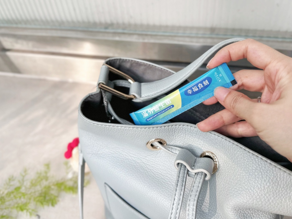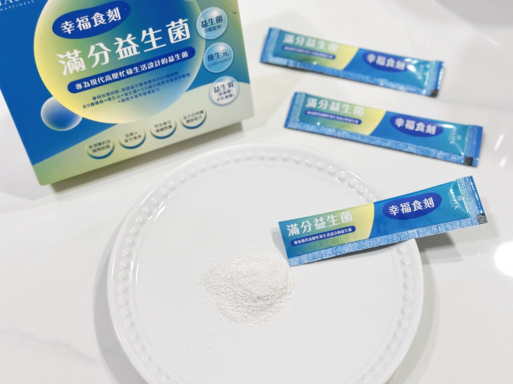 「幸福食刻滿分益生菌」的外觀設計清新簡約,鋁罐包裝搭配獨立小包粉末,一天一包,攜帶方便,無論出門旅遊或日常使用都很順手。